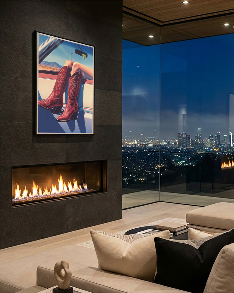 This artwork captures a quiet moment of freedom somewhere along a lonely desert highway. A pair of striking red cowboy boots rests casually out the window of a vintage car - a symbol of independence, adventure and the timeless romance of the open road.