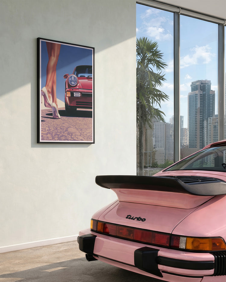 This artwork captures a striking moment in the open desert, where the unmistakable front of a classic red Porsche meets the bold elegance of retro fashion. The composition plays with contrast - sleek automotive engineering beside the sharp silhouette of high heels standing confidently in the sand.