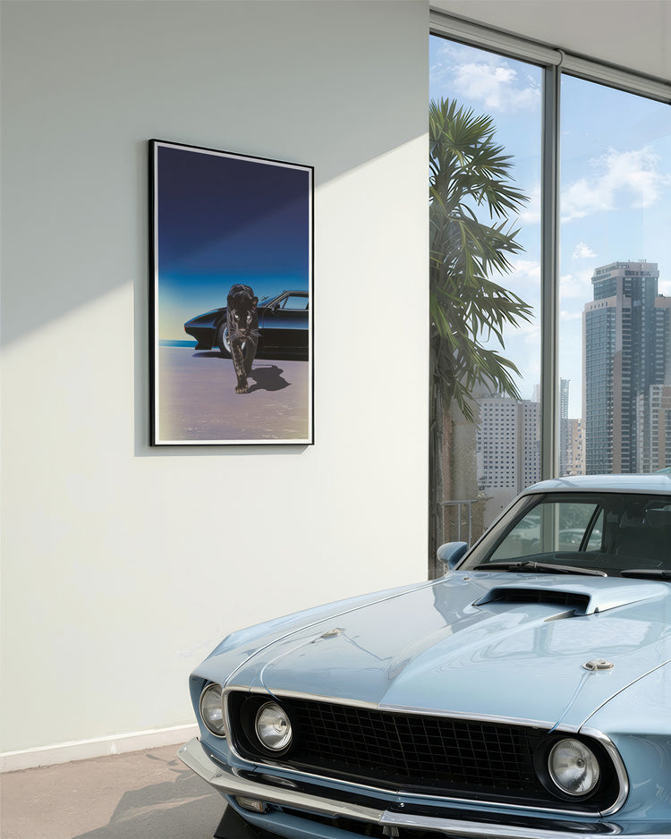 This artwork captures a moment of quiet dominance - a sleek black panther walking confidently across an empty coastal road, with a striking retro supercar resting in the background. Both share the same visual language: low, powerful, and effortlessly intimidating.
