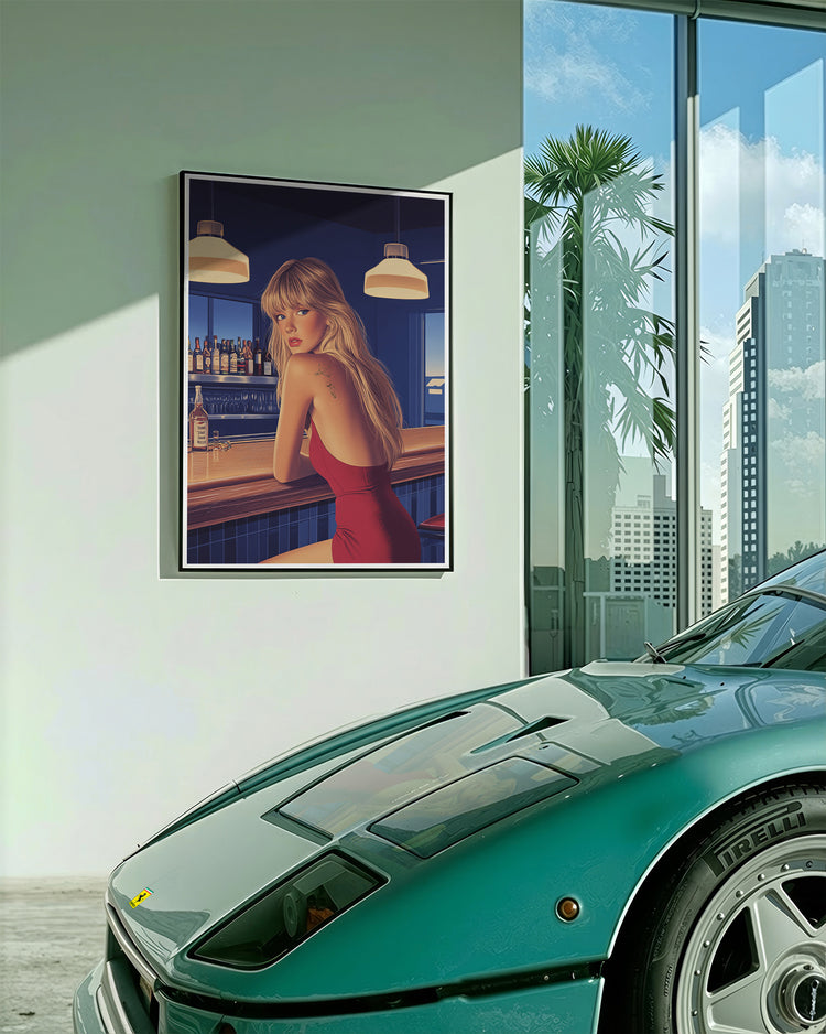 This artwork captures the quiet atmosphere of a late-night bar - a place where conversations fade into the background and the glow of warm lights creates an intimate, cinematic mood. A woman in a striking red dress leans against the bar, turning back with a glance that feels both mysterious and effortlessly confident.