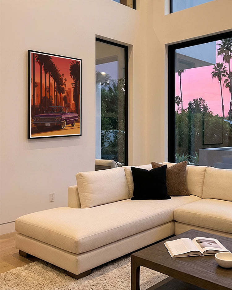 This artwork captures the unmistakable atmosphere of a classic Los Angeles sunset - where towering palm trees frame the skyline and a beautifully detailed purple lowrider glides down the boulevard.
